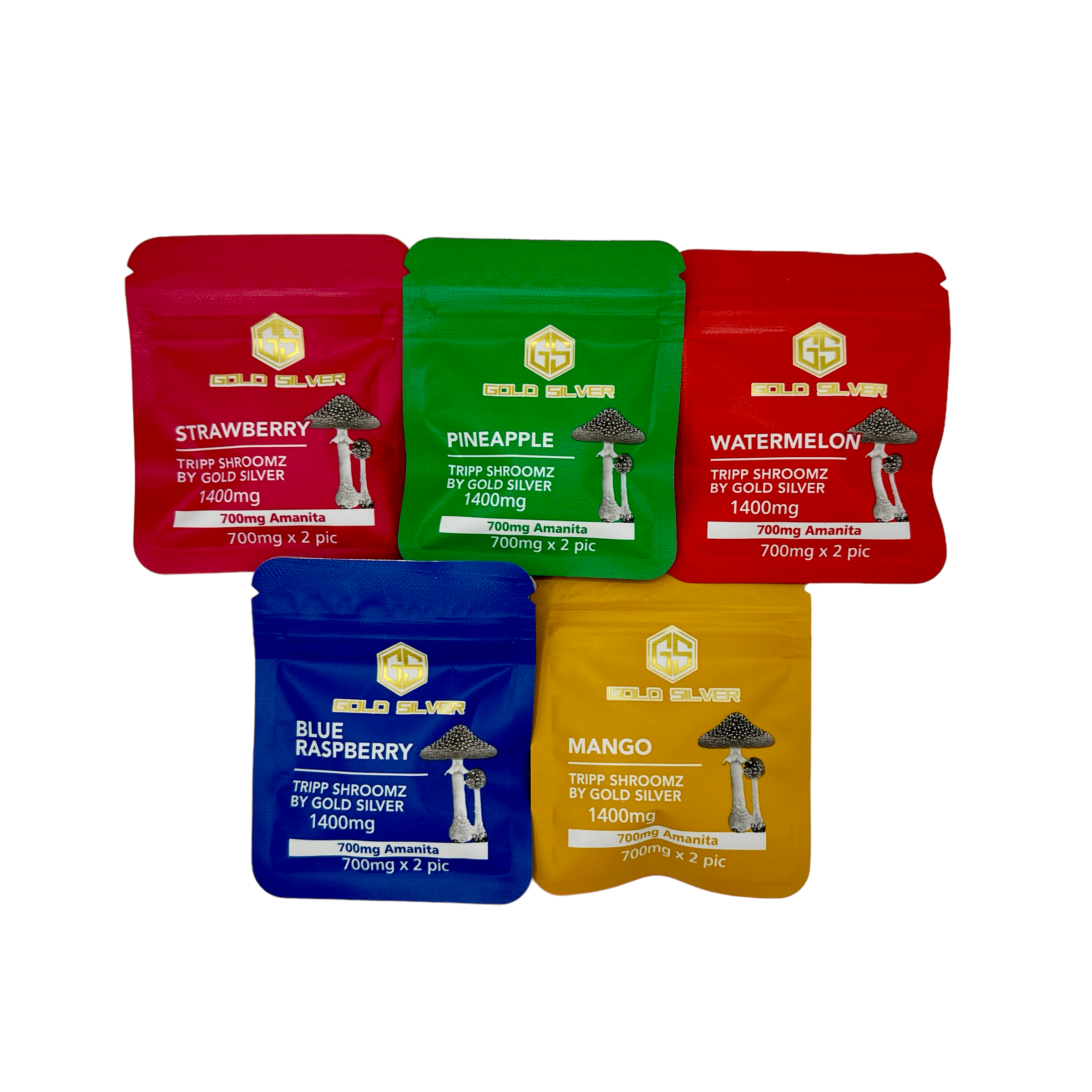 Strawberry, Watermelon, Mango, Blue Raspberry, Pineapple.